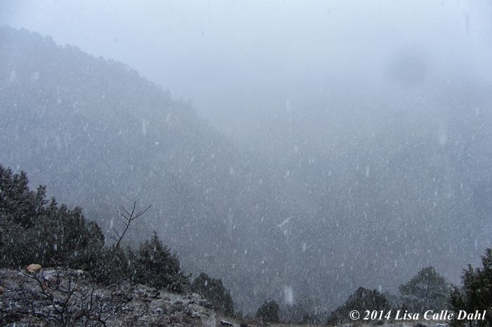 Dejamos el coche y comenzamos a pie. Se adivina lo espectacular del paisaje, aunque en esta ocasión, la nieve se está haciendo tan espesa que no se ve casi nada: